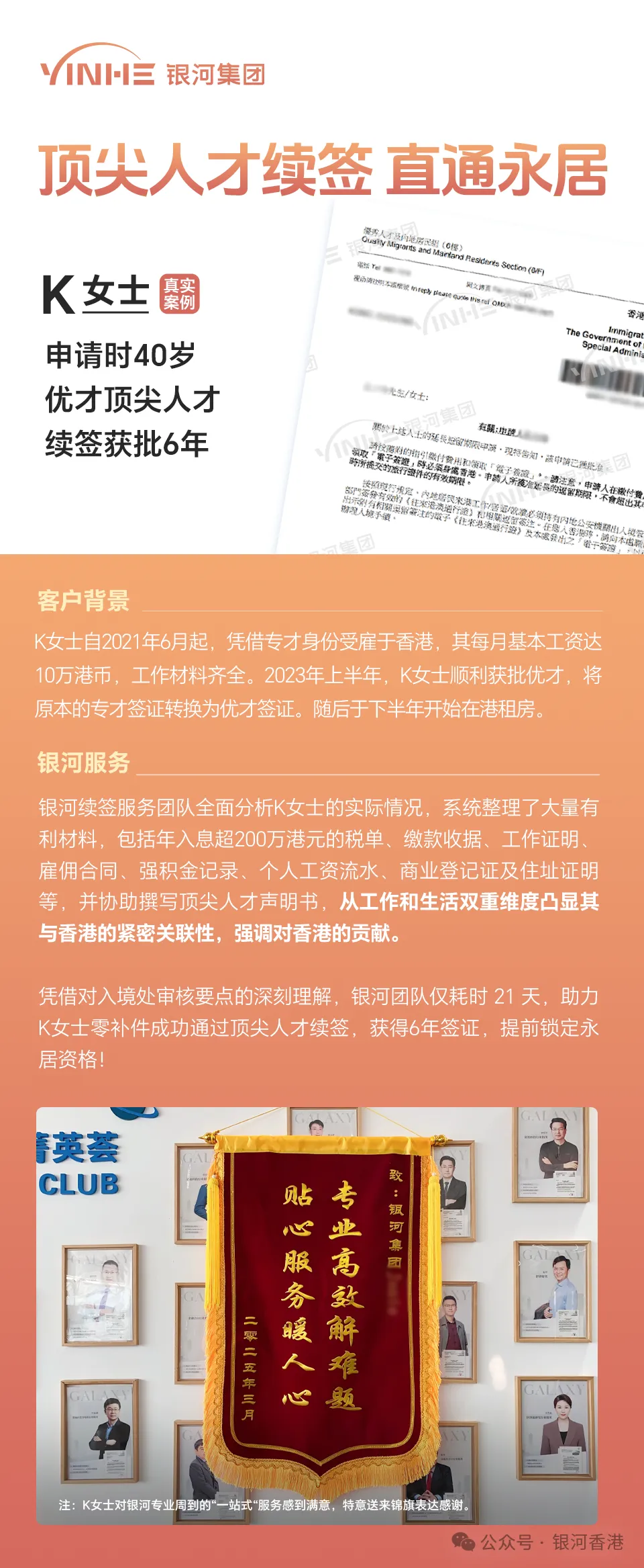 凭借对入境处审核要点的深刻理解,银河团队仅耗时21天,助力K女士零补件成功通过顶尖人才续签,获得6年签证,提前锁定永居资格!