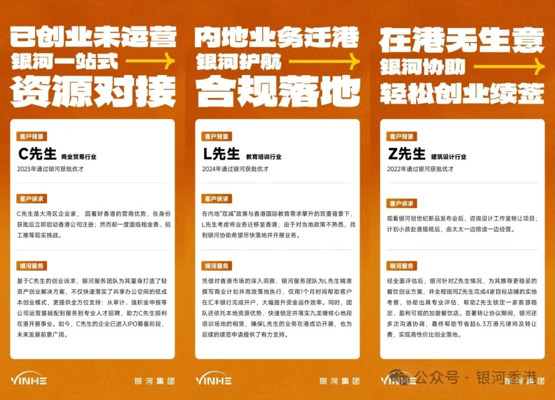 银河提供的不仅是符合港府要求的公司全套商务服务,更关键的是合法合规的让你真实创业,不仅解决公司地址的续签问题,也让您的事业发展实现长期可持续增长,选择银河集团,从身份申请到公司注册、企业运营以及续签到永居可以一次解决。